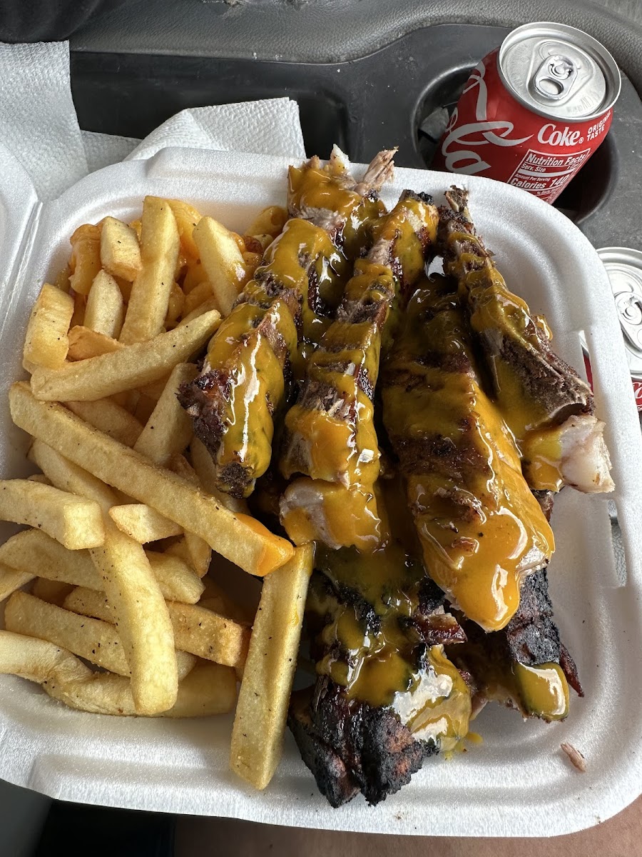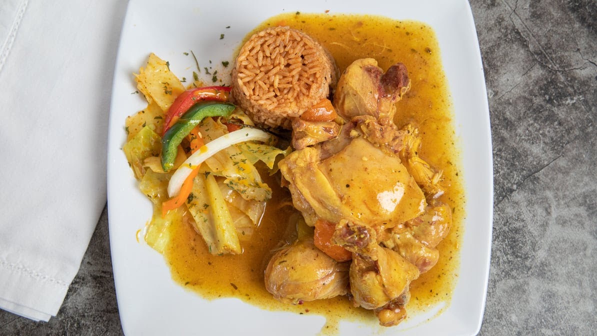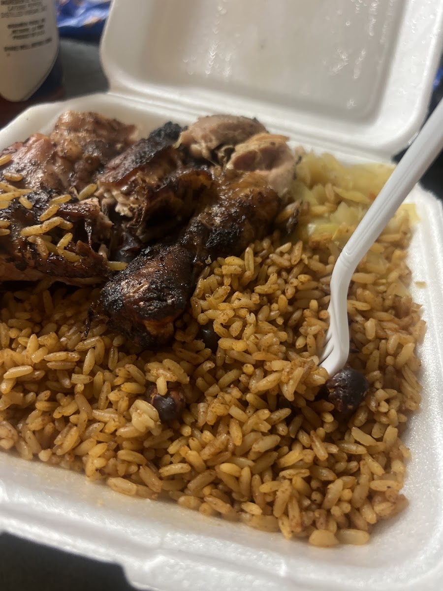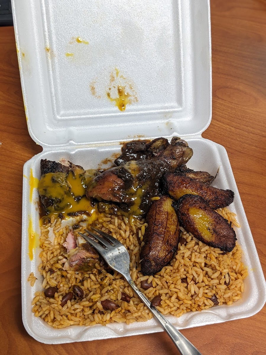 I’ve eaten here more times than I can count while working on a nearby construction project. My go-to order is the fried chicken with rice and peas and a side of plantains. The chicken always comes out hot, seasoned through the bone, and never greasy. Once I asked how they keep it so crisp even during the lunch rush, and the cook explained their process: the chicken is marinated overnight, dredged in seasoned flour, then rested before frying so the coating actually sticks. That little pause step is something serious kitchens swear by, and it shows.